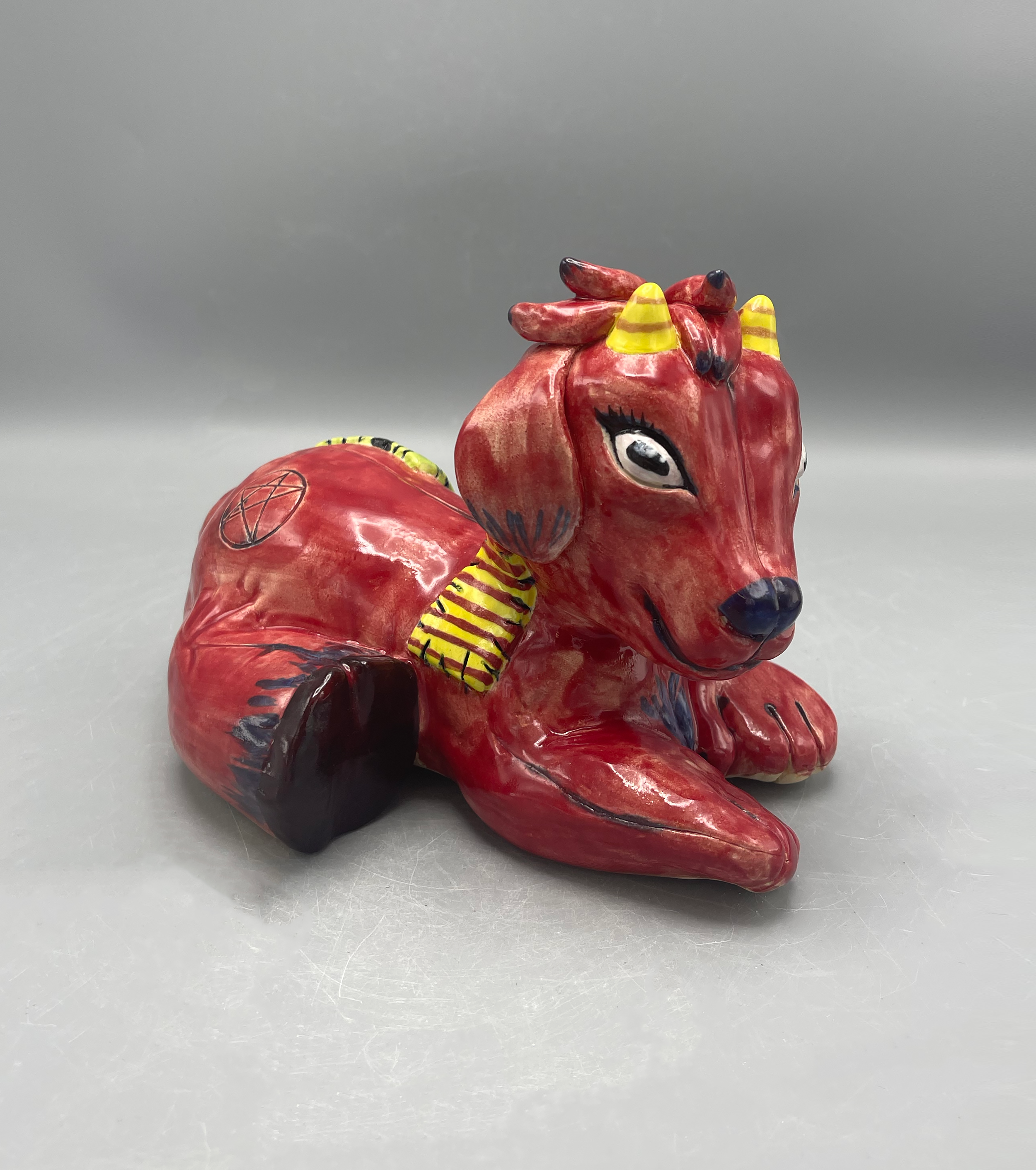 This frankenstein satan plushie was made by using incomplete existing pottery molds and then creating something from them. I used the body of a Christmas reindeer mold then sculpted the front hooves into feet. I then sculpted a baby goats head for the head of my Beelzebub stuffed animal. Lastly I glazed my Tickle-Me-Lucifer using a bright color palette of underglazes and clear glaze.